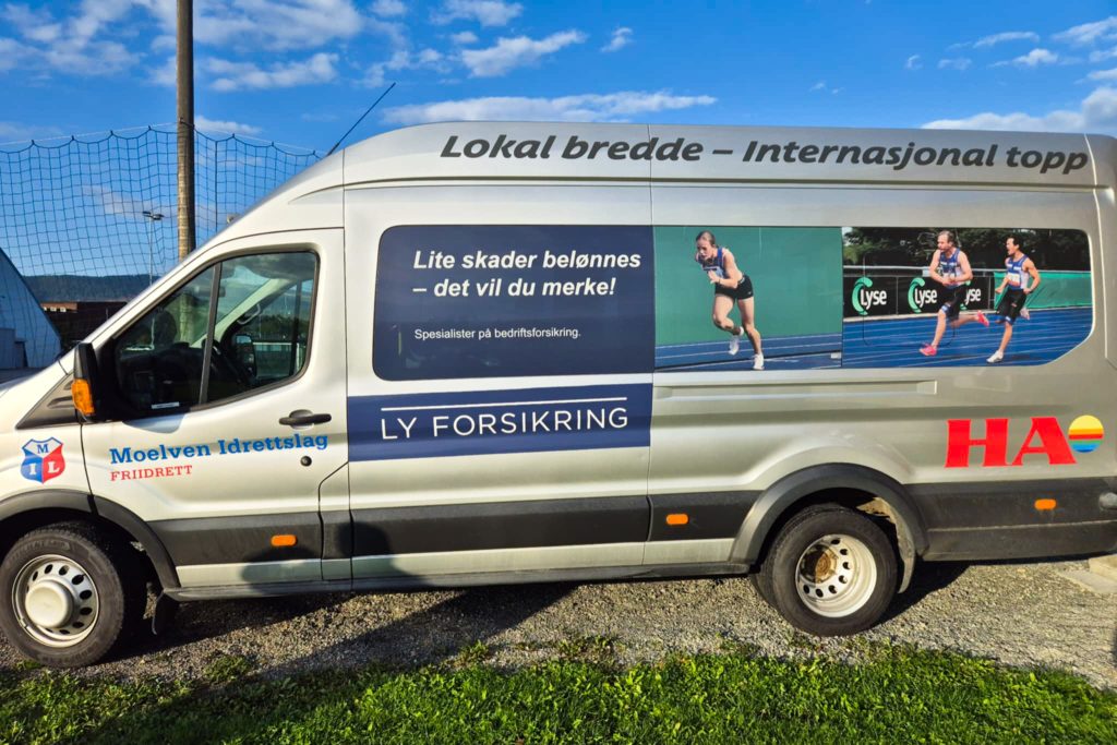 Moelv Friidrett sin egen minibuss med tydelig Ly Forsikring profilering